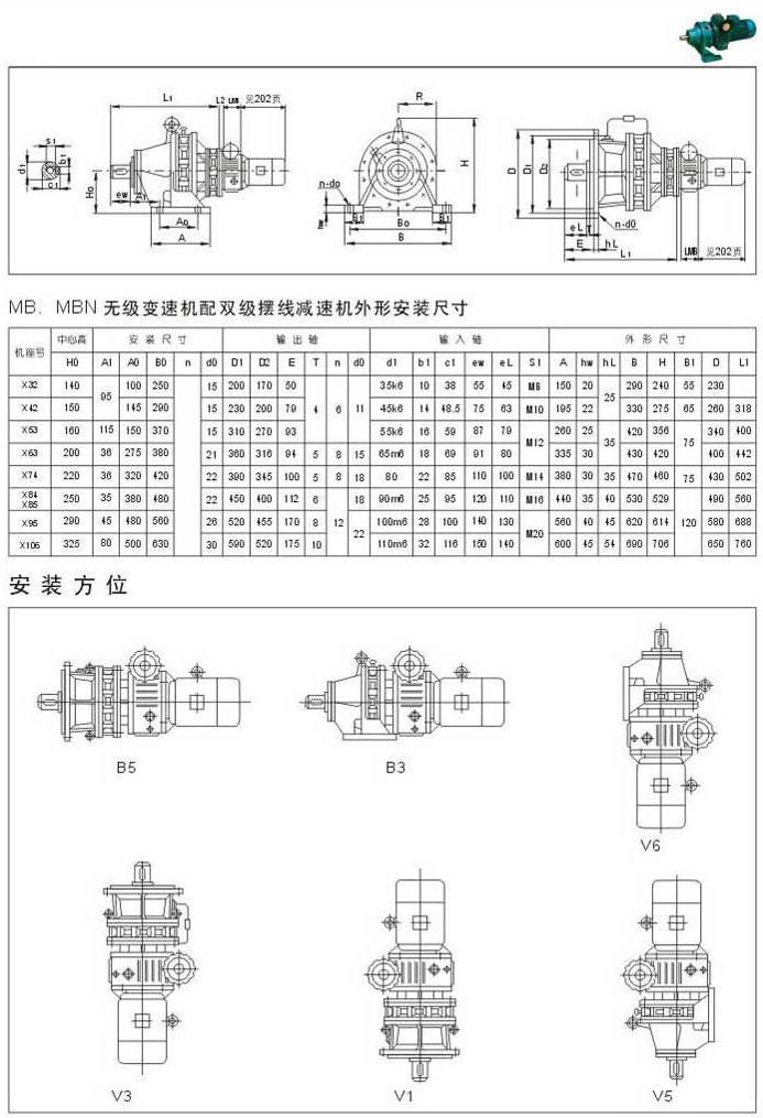 MB.MBN無(wú)級(jí)變速機(jī)配雙級(jí)擺線減速機(jī)外型安裝尺寸安裝方位